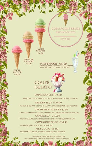 We hebben gekozen om met spatels te werken. Bij ons kan je geen bolletje ijs krijgen maar wel: small gelato aan € 3.20medium gelato aan € 5.00 en een large gelato aan € 6.60